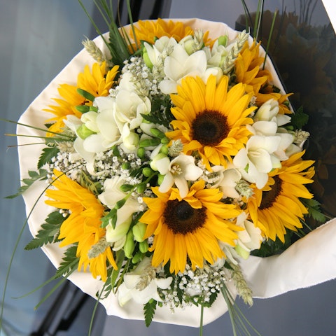 Receber um bouquet de girassóis é uma maravilhosa surpresa para uma noiva nas vésperas do seu casamento. O girassol é um maravilhoso presente de casamento com um simbolismo profundo associado ao amor e à felicidade. O girassol é a flor perfeita para desejar um casamento feliz!
